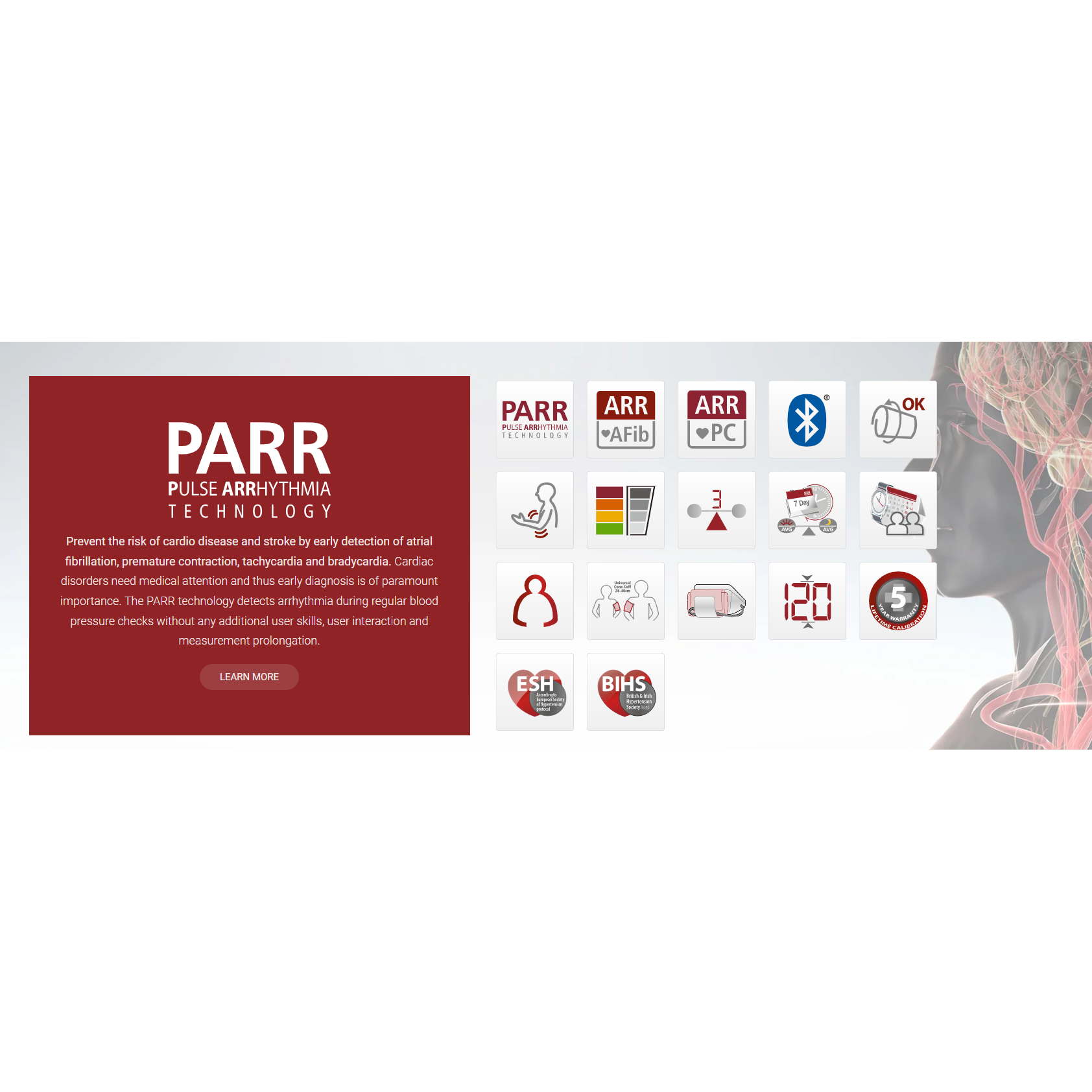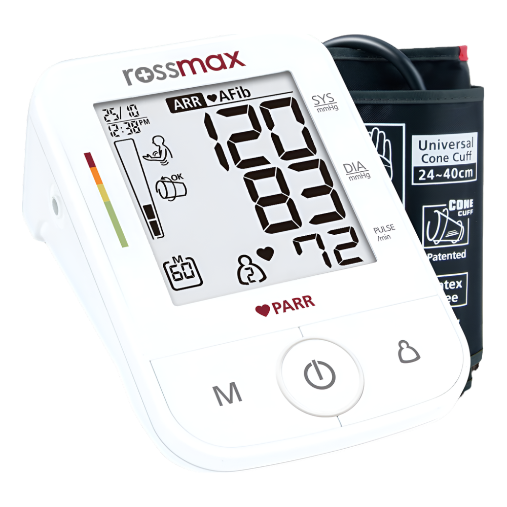 Blóðþrýstingsmælir frá Rossmax með bluetooth tengingu. Hægt er að greina hvort áhætta sé á hjartasjúkdómum og heilablóðfalli með því að greina snemma gáttatif, ótímabæran samdrátt, hraðtakt og hægtakt. Mælirinn greinir meðal annars þessa þætti og heldur utan um mælingarnar með Rossmax appinu svo auðvelt er að skoða aftur í tímann eða sýna lækni niðurstöður.