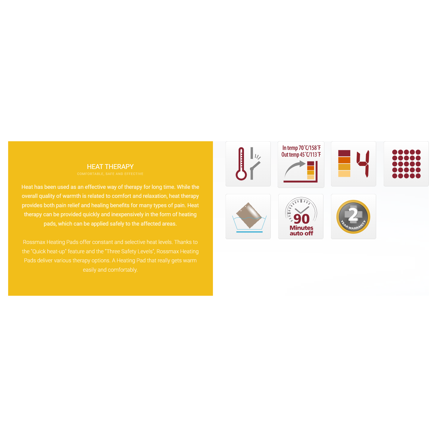 Hitateppi frá Rossmax eru með ofhitnunarvörn og með 4 hitastillingum. Hægt er að fjarlægja áklæðið og þvo. Kemur með einfaldri fjarstýringu til að stilla hita. Stærð 30 X 40 cm