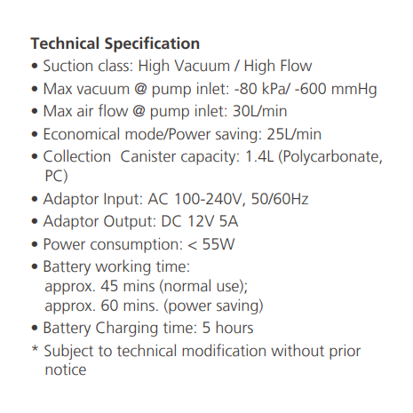 Öflug sogvél frá Rossmax sem hentar bæði á heilbrigðisstofnanir og fyrir heimanotkun. Sogvélin er með lithium batteríum sem duga í allt að 60 mínútur í stöðugri notkun.