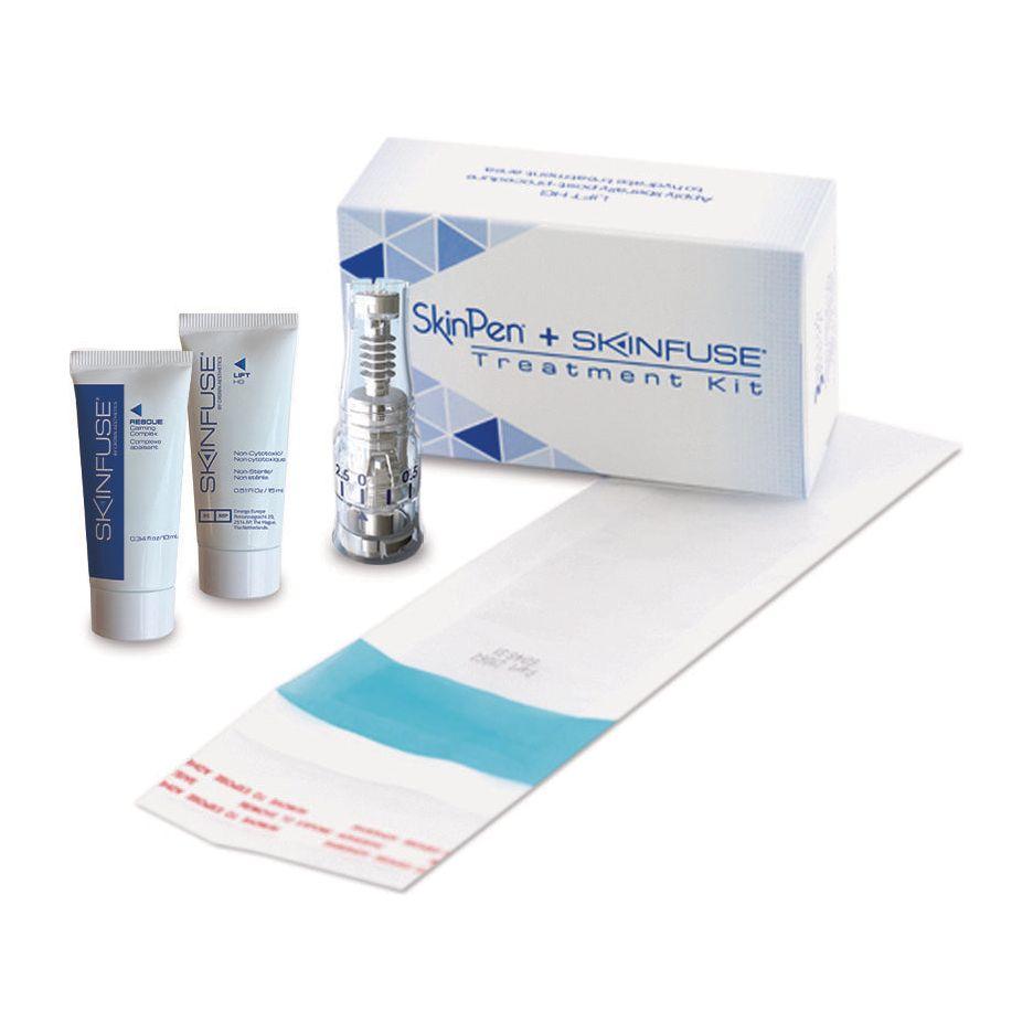 SkinPen Sett inniheldur 4 vörur sem eru nauðsynlegar fyrir eina meðferð með SkinPen. Í settinu er poki utan um pennann, nálarhaus, sérstakt gel sem er notað á meðan meðferð stendur og kælikrem sem er notað eftir meðferð.