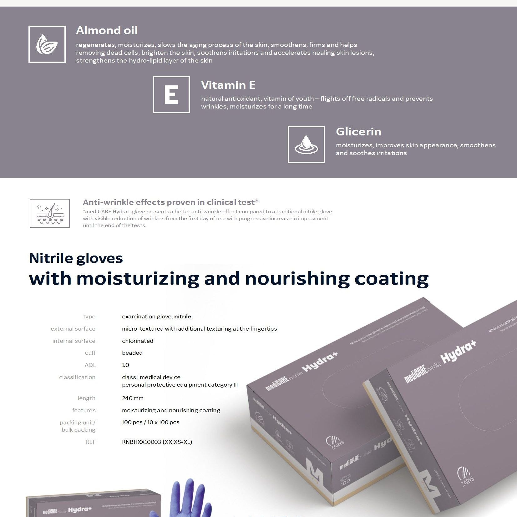 Hydra+ skoðunarhanskarnir frá Zarys eru einstakir hanskar á markaðnum. Ástæðan er að þeir eru með húðvernd fyrir hendurnar. Hvort sem notandinn er með húðvandamál, þurrar og aumar hendur eða einfaldlega ef fólk vill hugsa betur um hendurnar þá eru Hydra+ nitrile hanskarnir frábær lausn.
